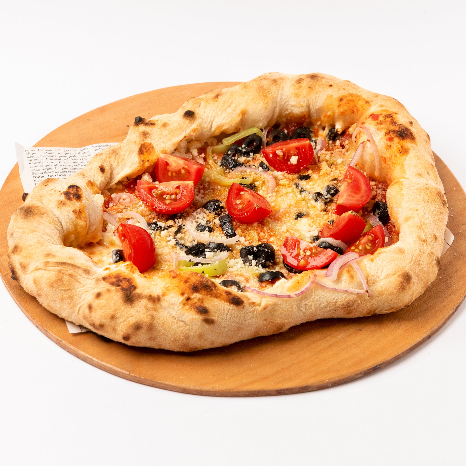 Доматен сос, моцарела, чушки, сирене фета, маслини, лук и чери домати